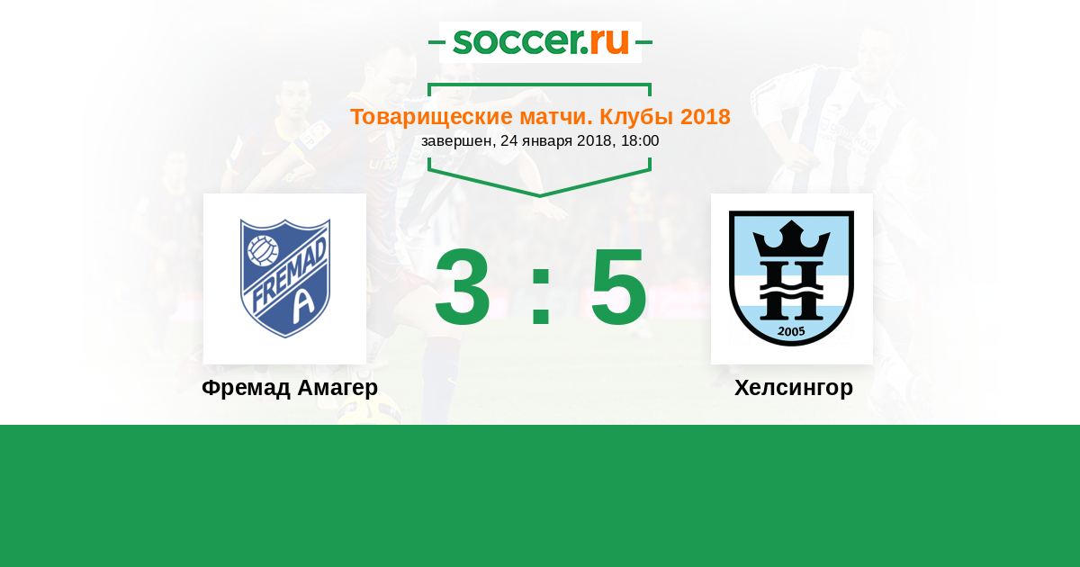 Товарищеские матчи. Клубы 02.02.2019 Фремад Амагер Логотип футбольный клуб Фремад Амагер (Копенгаген) 0:0 Логотип футбольный клуб Хелсингор Хелсингор