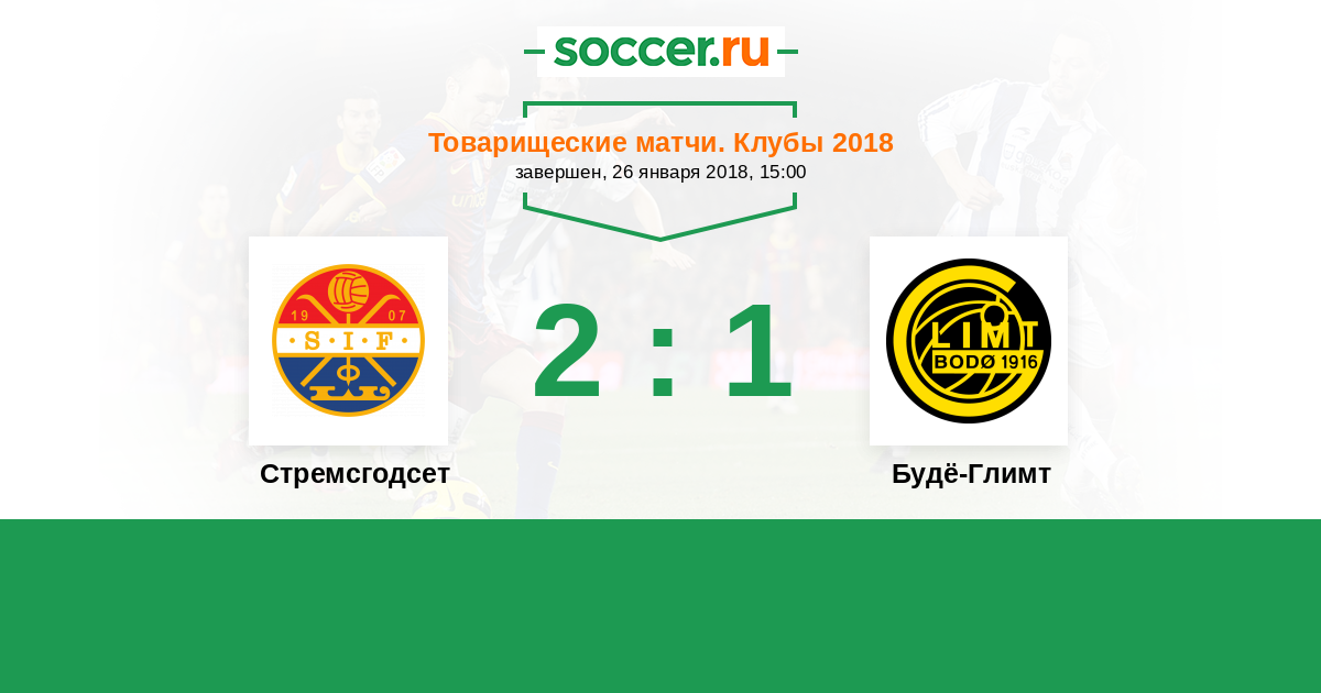 Товарищеские матчи. Клубы 15.02.2019 Стремсгодсет Логотип футбольный клуб Стремсгодсет (Драммен) 0:5 Логотип футбольный клуб Будё-Глимт Будё-Глимт