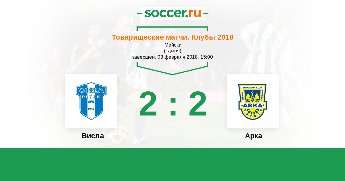 Товарищеские матчи. Клубы 07.09.2018 Арка Логотип футбольный клуб Арка (Гдыня) 0:0 Логотип футбольный клуб Висла (Плоцк) Висла