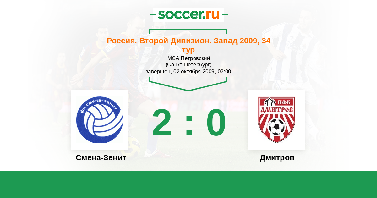 Россия. Вторая лига. Группа 2 02.10.2009 Смена-Зенит Логотип футбольный клуб Смена-Зенит (Санкт-Петербург) 2:0 Логотип футбольный клуб Дмитров Дмитров