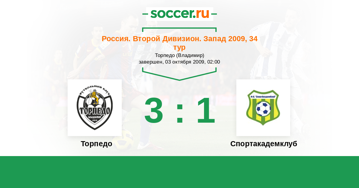 Россия. Вторая лига. Группа 2 21.06.2009 Спортакадемклуб Логотип футбольный клуб Спортакадемклуб (Москва) 1:2 Логотип футбольный клуб Торпедо (Владимир) Торпедо