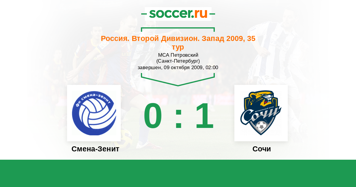 Россия. Вторая лига. Группа 2 09.10.2009 Смена-Зенит Логотип футбольный клуб Смена-Зенит (Санкт-Петербург) 0:1 Логотип футбольный клуб Динамо (Сочи) Динамо