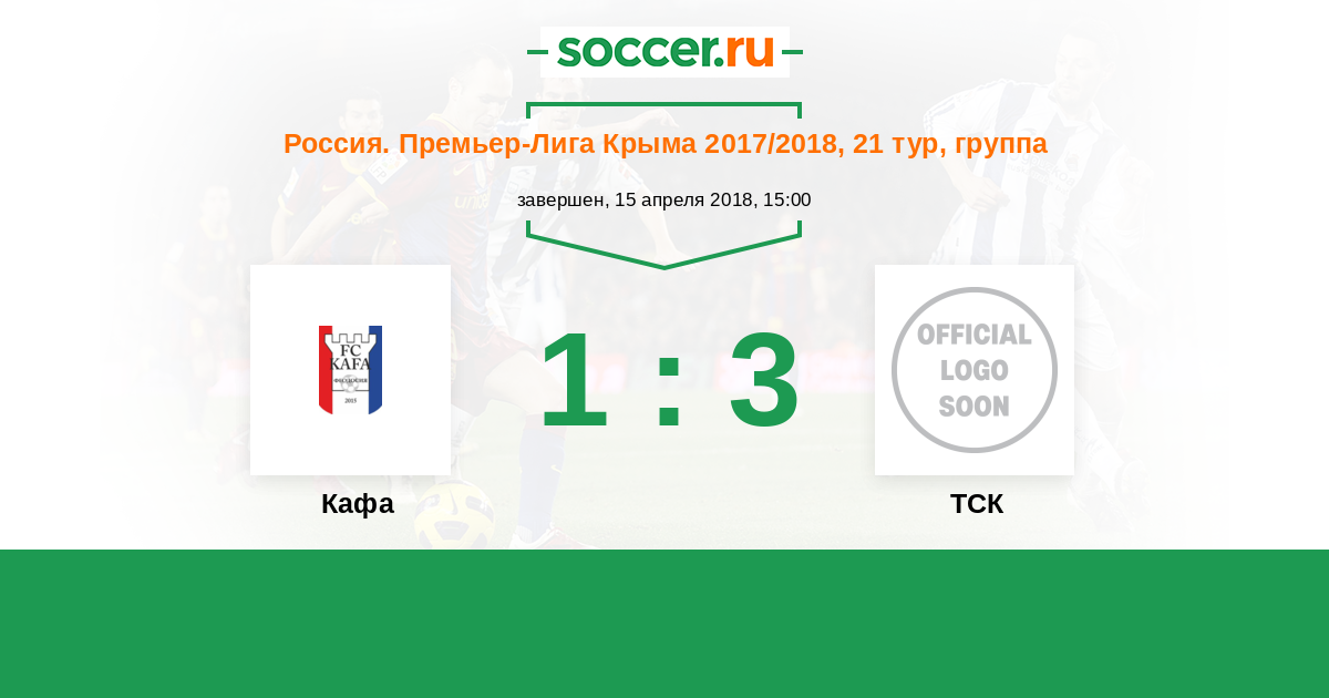 Россия. Премьер-Лига Крыма 02.06.2018 ТСК Логотип футбольный клуб ТСК (Симферополь) 0:2 Логотип футбольный клуб Кафа (Феодосия) Кафа