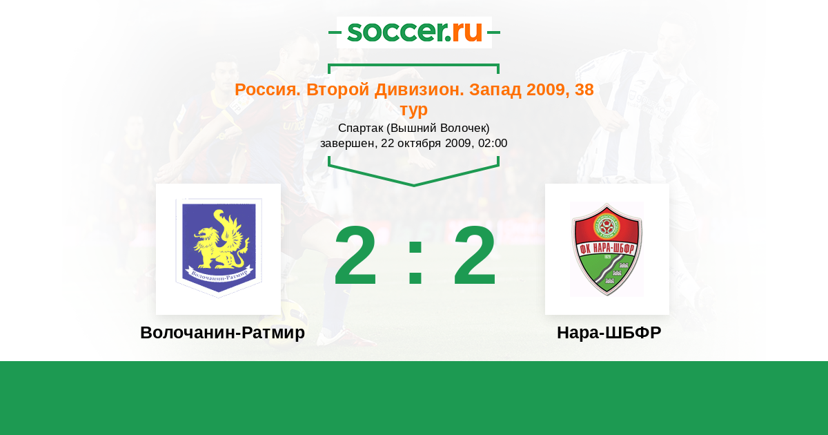 Россия. Вторая лига. Группа 2 11.07.2009 Нара-ШБФР Логотип футбольный клуб Нара-ШБФР (Наро-Фоминск) 0:0 Логотип футбольный клуб Волочанин-Ратмир (Вышний Волочек) Волочанин-Ратмир