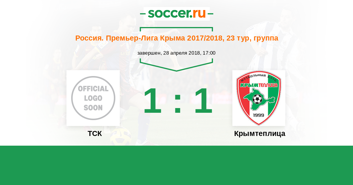 Россия. Премьер-Лига Крыма 08.04.2017 Крымтеплица Логотип футбольный клуб Крымтеплица (Молодежное) 1:0 Логотип футбольный клуб ТСК (Симферополь) ТСК