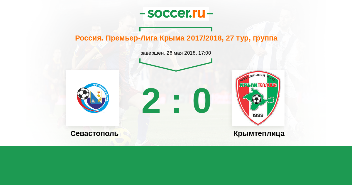 Россия. Премьер-Лига Крыма 24.09.2017 Крымтеплица Логотип футбольный клуб Крымтеплица (Молодежное) 0:4 Логотип футбольный клуб Севастополь Севастополь