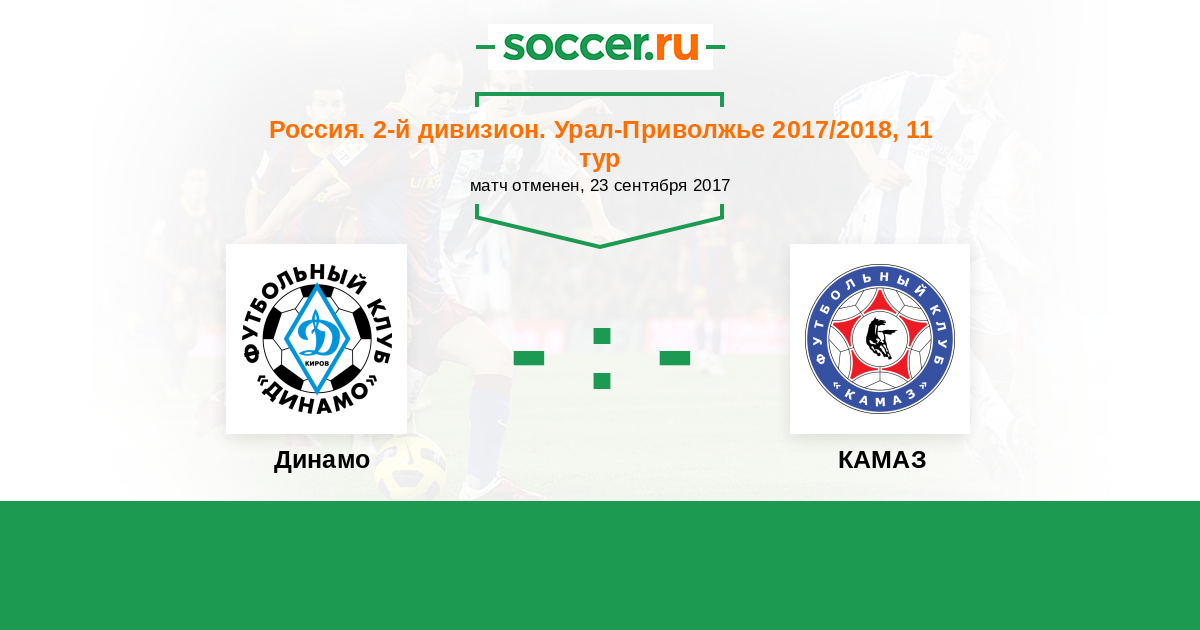 Россия. Вторая лига. Группа 4 26.09.2016 КАМАЗ Логотип футбольный клуб КАМАЗ (Набережные Челны) 1:1 Логотип футбольный клуб Динамо Киров Динамо Киров