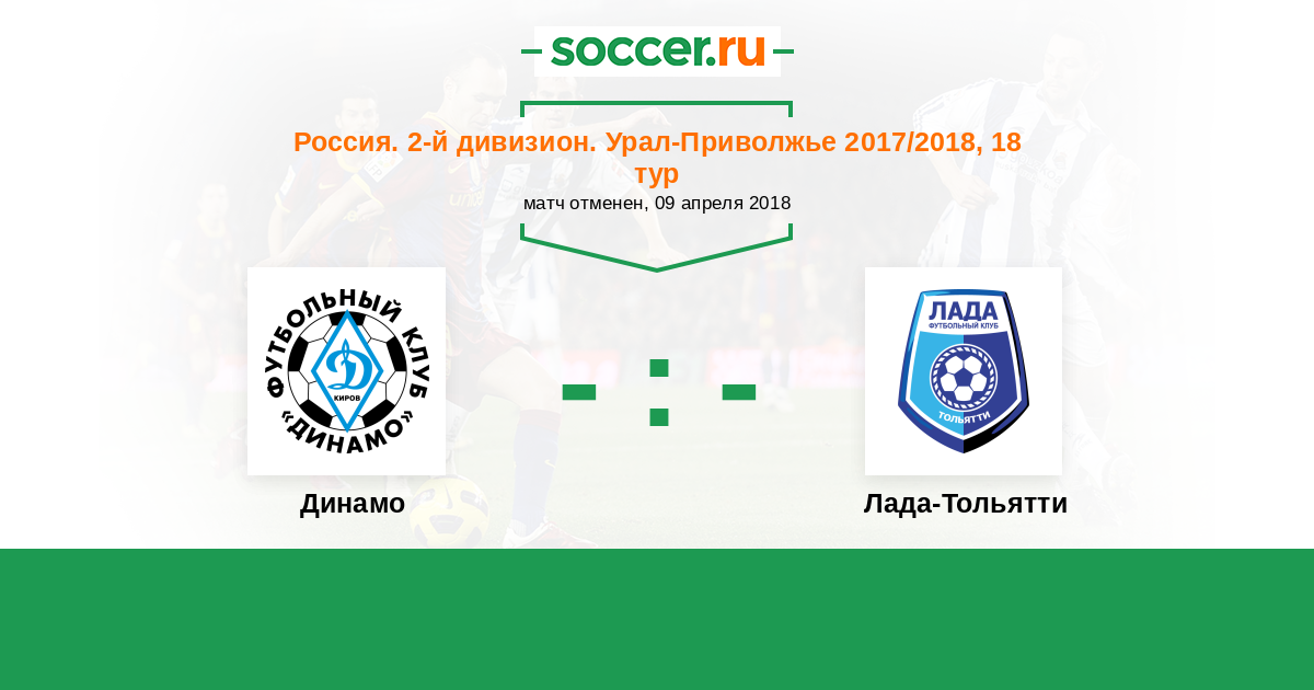 Россия. Вторая лига. Группа 4 30.04.2017 Динамо Киров Логотип футбольный клуб Динамо Киров 2:0 Логотип футбольный клуб Лада-Тольятти Лада-Тольятти