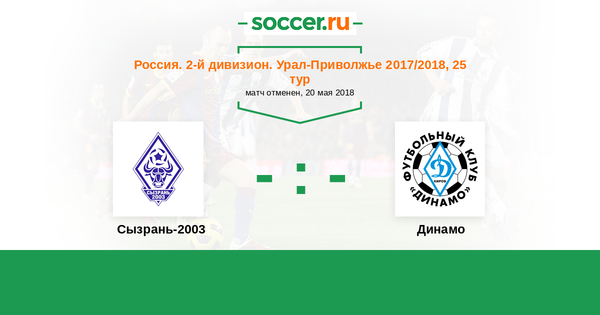 Россия. Вторая лига. Группа 4 25.04.2017 Сызрань-2003 Логотип футбольный клуб Сызрань-2003 2:0 Логотип футбольный клуб Динамо Киров Динамо Киров