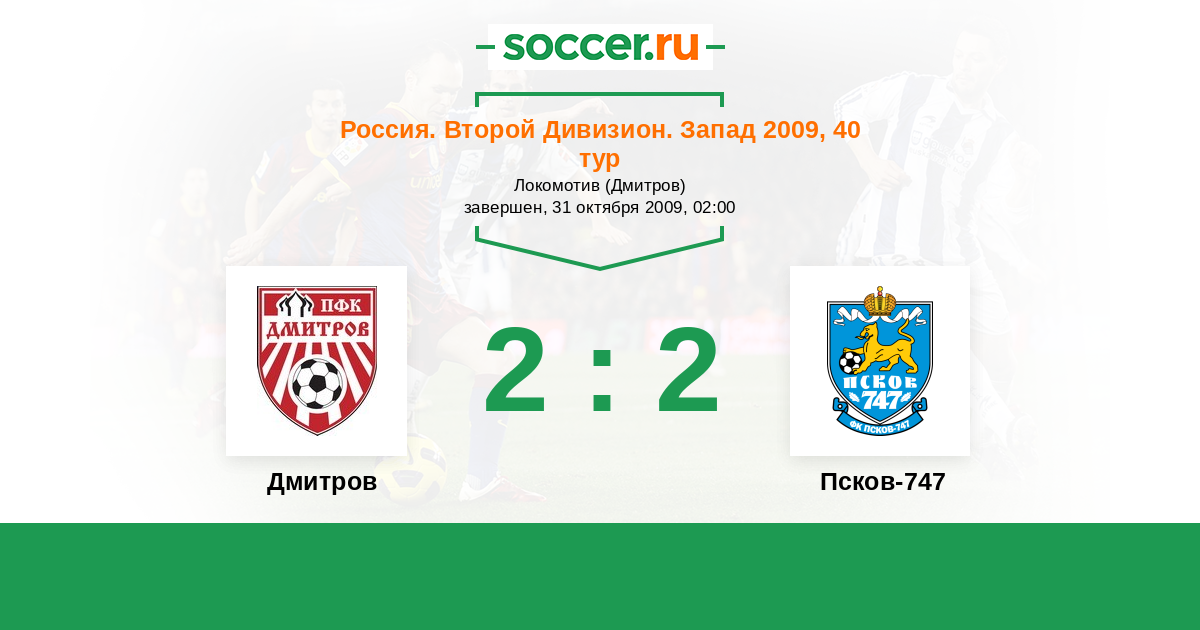 Россия. Вторая лига. Группа 2 31.10.2009 Дмитров Логотип футбольный клуб Дмитров 2:2 Логотип футбольный клуб Псков-747 Псков-747
