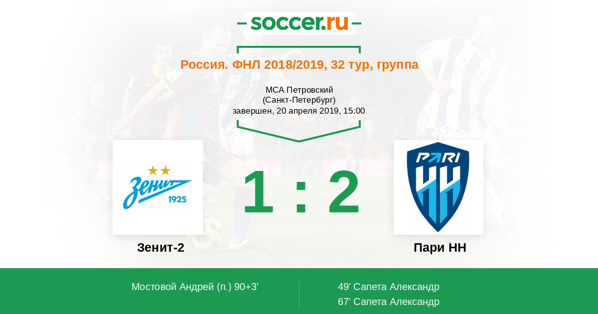 Протокол матча Зенит-2 против Пари НН