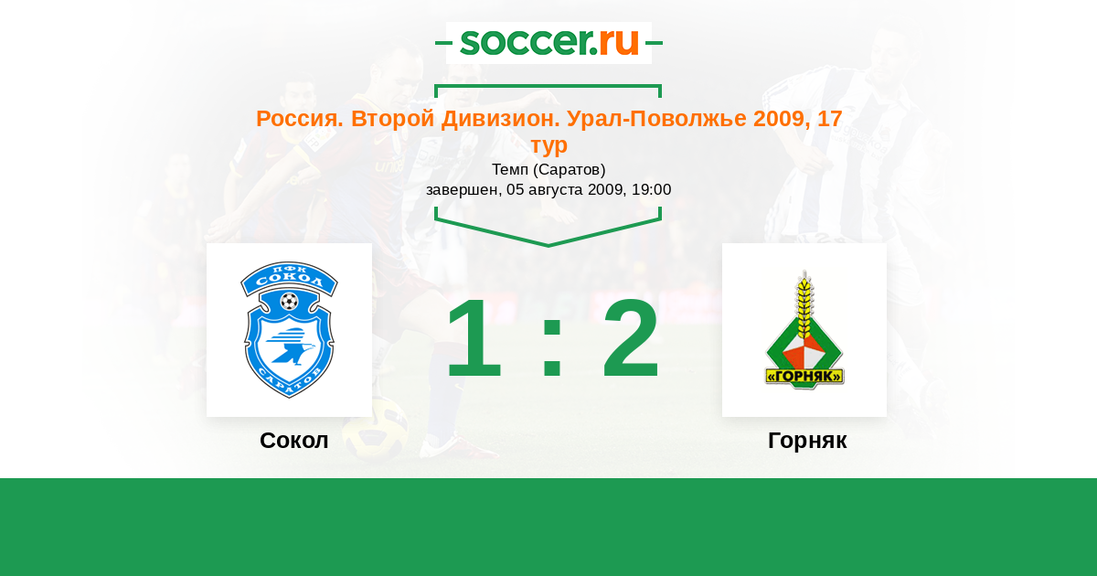 Россия. Вторая лига. Группа 4 26.04.2009 Горняк Логотип футбольный клуб Горняк (Учалы) 1:0 Логотип футбольный клуб Сокол (Саратов) Сокол