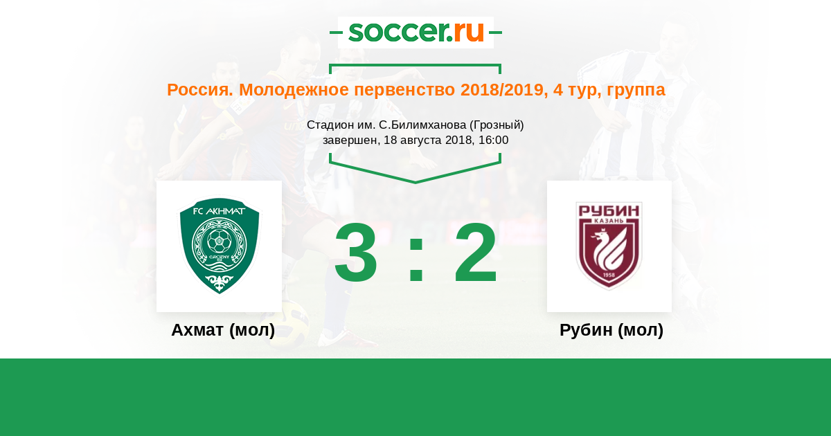 Россия. Премьер-Лига U21 28.07.2019 Рубин (мол) Логотип футбольный клуб Рубин (мол) (Казань) 1:1 Логотип футбольный клуб Ахмат (мол) (Грозный) Ахмат (мол)