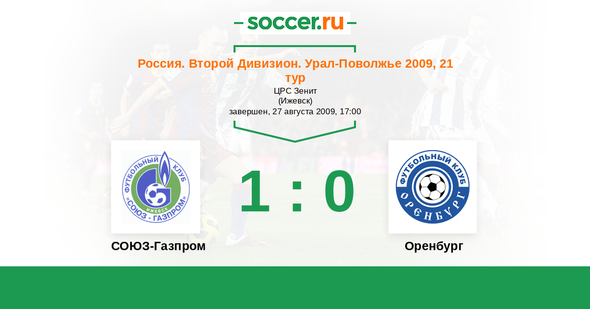Россия. Вторая лига. Группа 4 19.05.2009 Газовик Логотип футбольный клуб Газовик (Оренбург) 0:1 Логотип футбольный клуб СОЮЗ-Газпром (Ижевск) СОЮЗ-Газпром