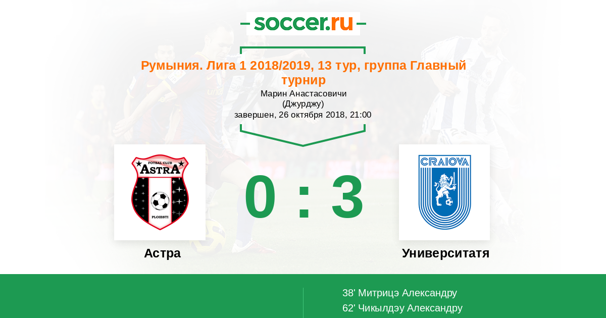Протокол матча Астра против Университатя Крайова