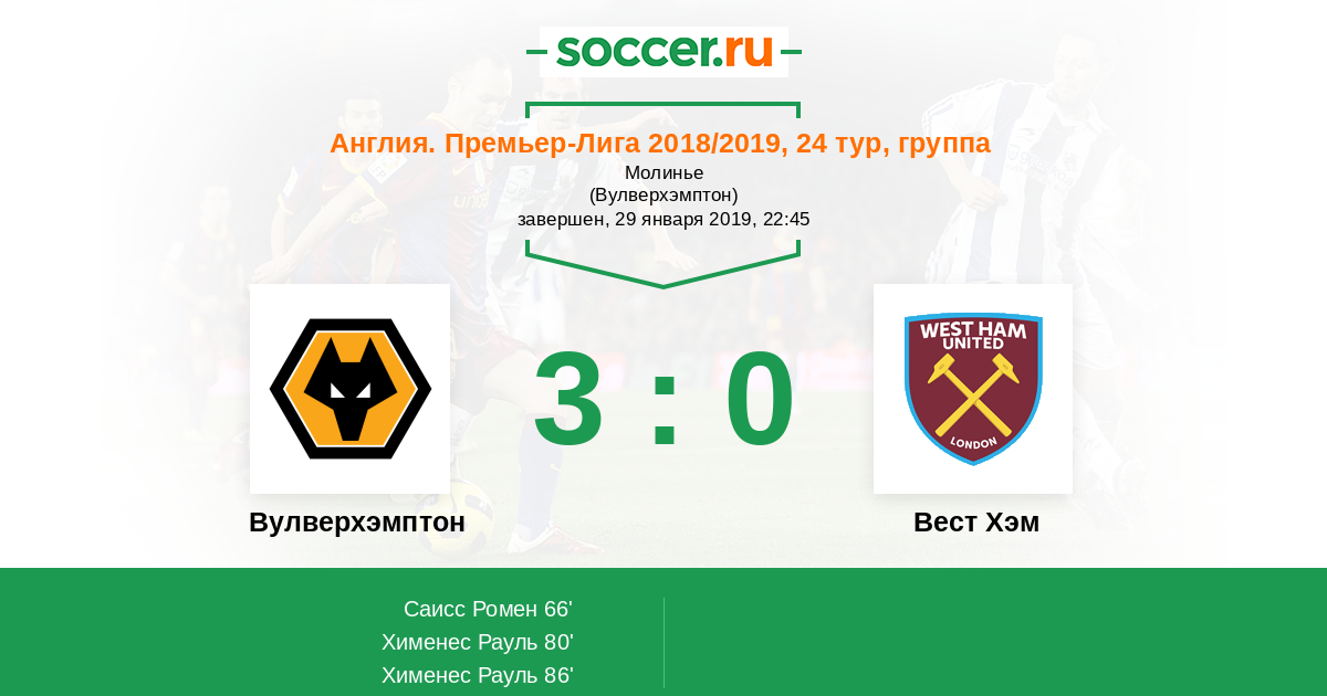 Протокол матча Вулверхэмптон против Вест Хэм