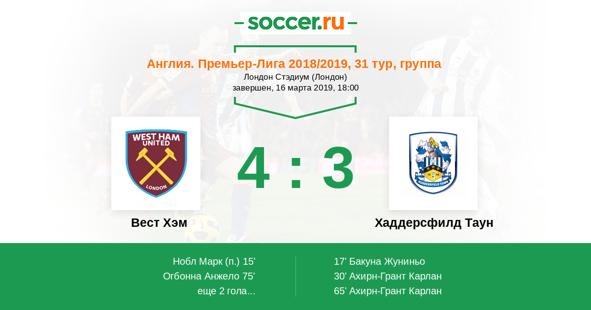Протокол матча Вест Хэм против Хаддерсфилд Таун