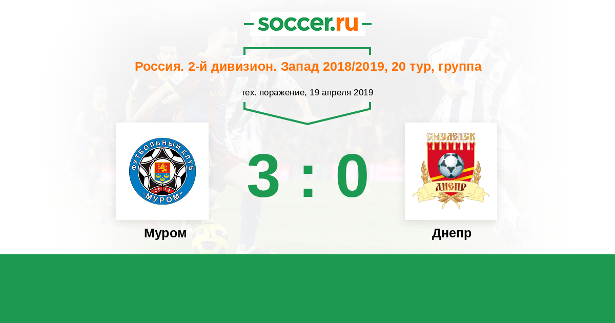 Россия. Вторая лига. Группа 2 19.04.2019 Муром Логотип футбольный клуб Муром 3:0 Логотип футбольный клуб Днепр (Смоленск) Днепр
