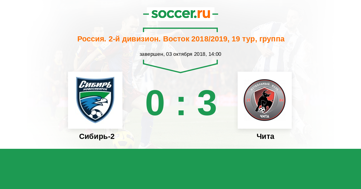 Россия. 2-й дивизион. Восток 03.10.2018 Сибирь-2 Логотип футбольный клуб Сибирь-2 (Новосибирск) 0:3 Логотип футбольный клуб Чита Чита