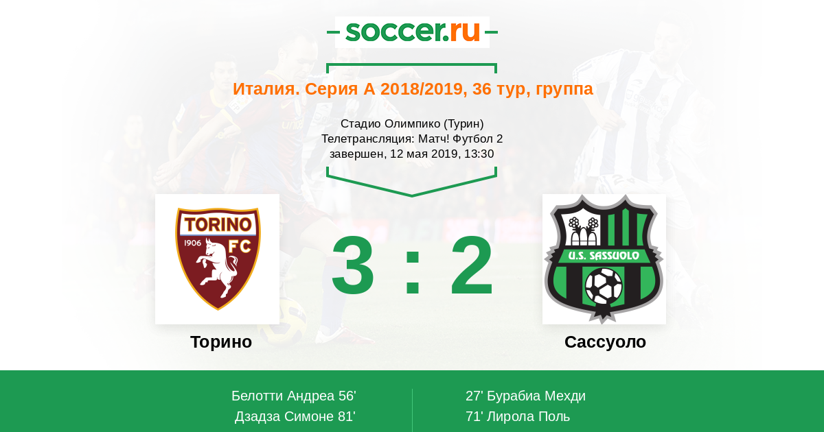 Протокол матча Торино против Сассуоло