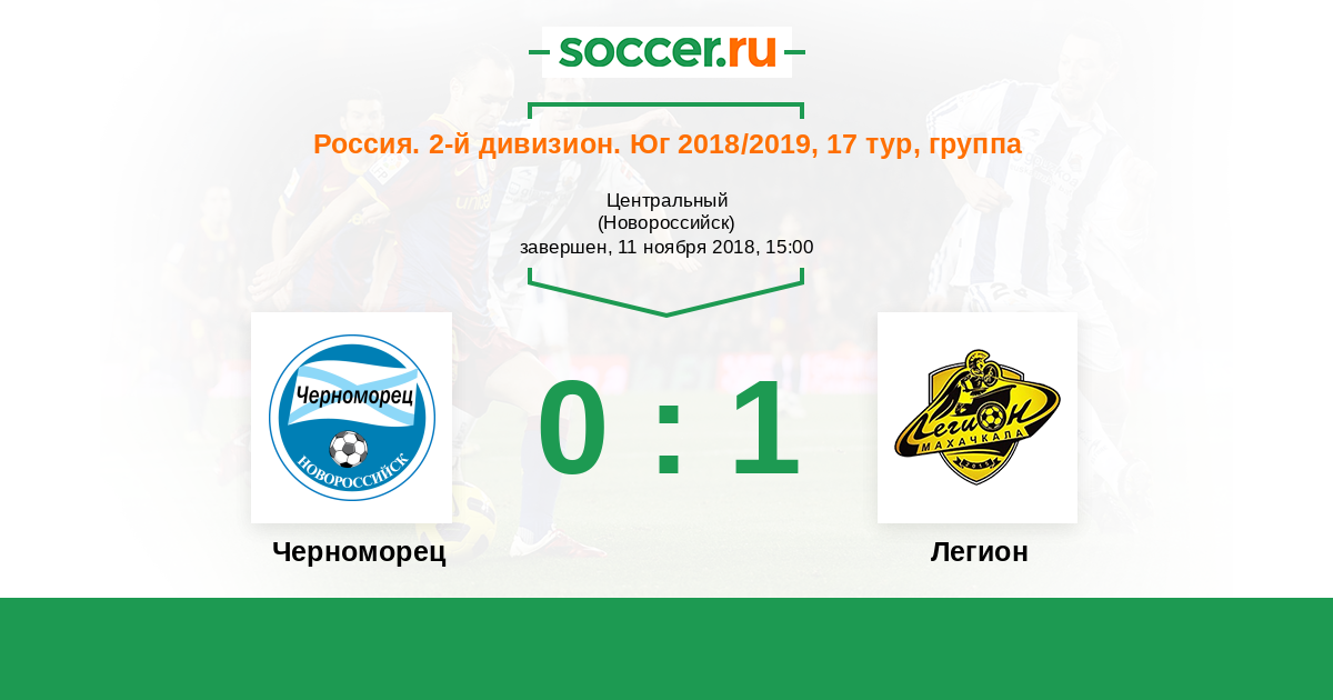 Россия. Вторая лига. Группа 1 11.08.2018 Легион Логотип футбольный клуб Легион (Махачкала) 0:1 Логотип футбольный клуб Черноморец (Новороссийск) Черноморец