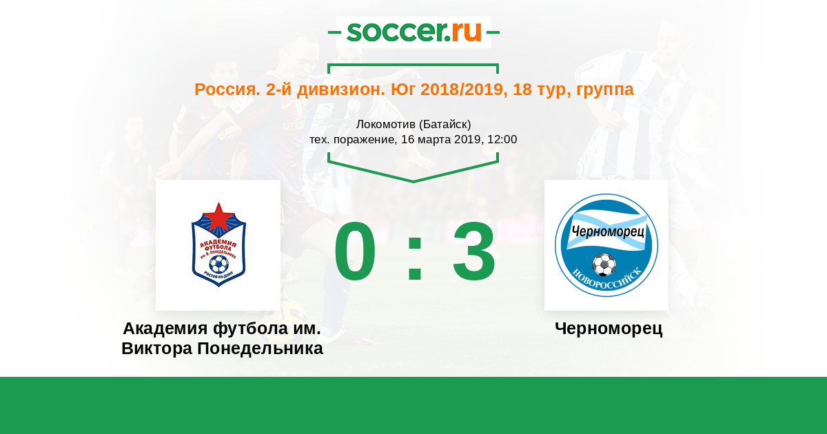 Россия. Вторая лига. Группа 1 06.04.2019 Чайка   3:0 Логотип футбольный клуб Академия футбола им. Виктора Понедельника (Батайск) Академия футбола им. Виктора Понедельника