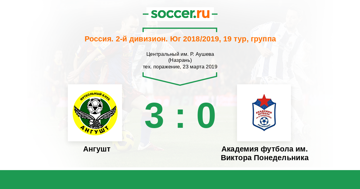 Россия. Вторая лига. Группа 1 28.10.2017 Академия футбола им. Виктора Понедельника Логотип футбольный клуб Академия футбола им. Виктора Понедельника (Батайск) 3:0 Логотип футбольный клуб Ангушт (Назрань) Ангушт