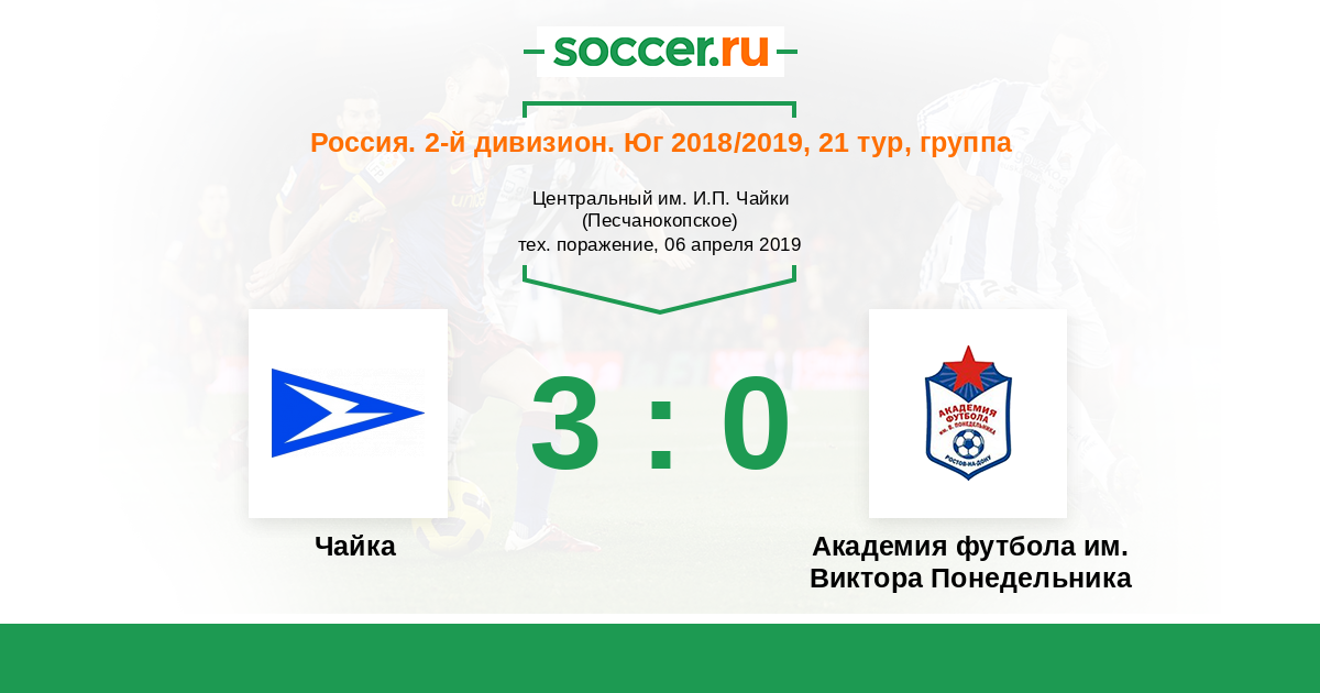 Россия. Вторая лига. Группа 1 06.04.2019 Чайка   3:0 Логотип футбольный клуб Академия футбола им. Виктора Понедельника (Батайск) Академия футбола им. Виктора Понедельника