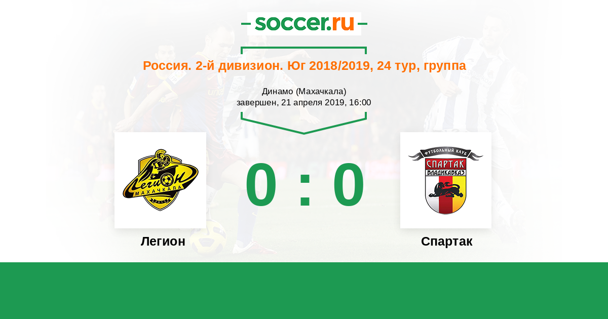 Россия. Вторая лига. Группа 1 23.10.2016 Легион Логотип футбольный клуб Легион (Махачкала) 1:1 Логотип футбольный клуб Спартак (Владикавказ) Спартак