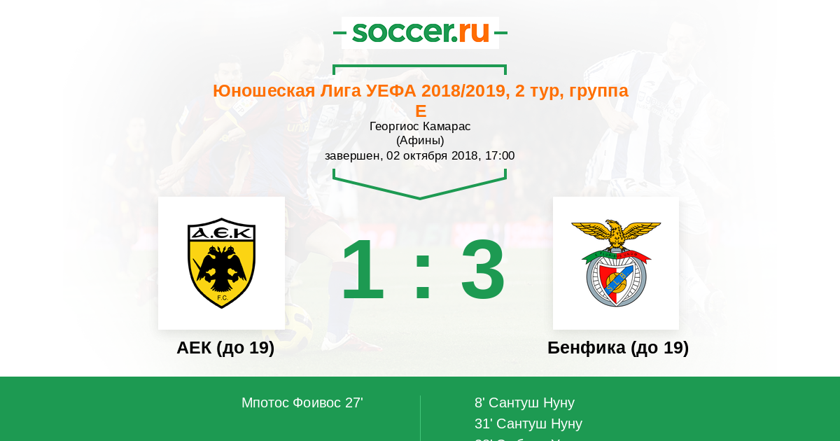 Протокол матча АЕК (до 19) против Бенфика (до 19)