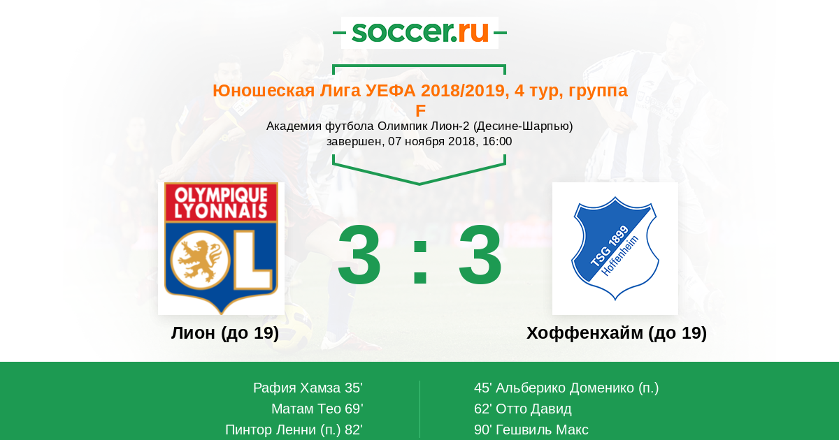 Протокол матча Лион (до 19) против Хоффенхайм (до 19)