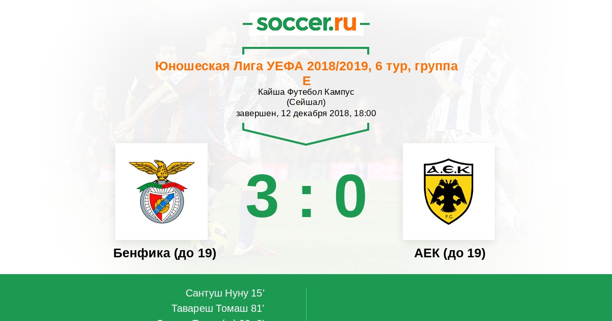 Протокол матча Бенфика (до 19) против АЕК (до 19)