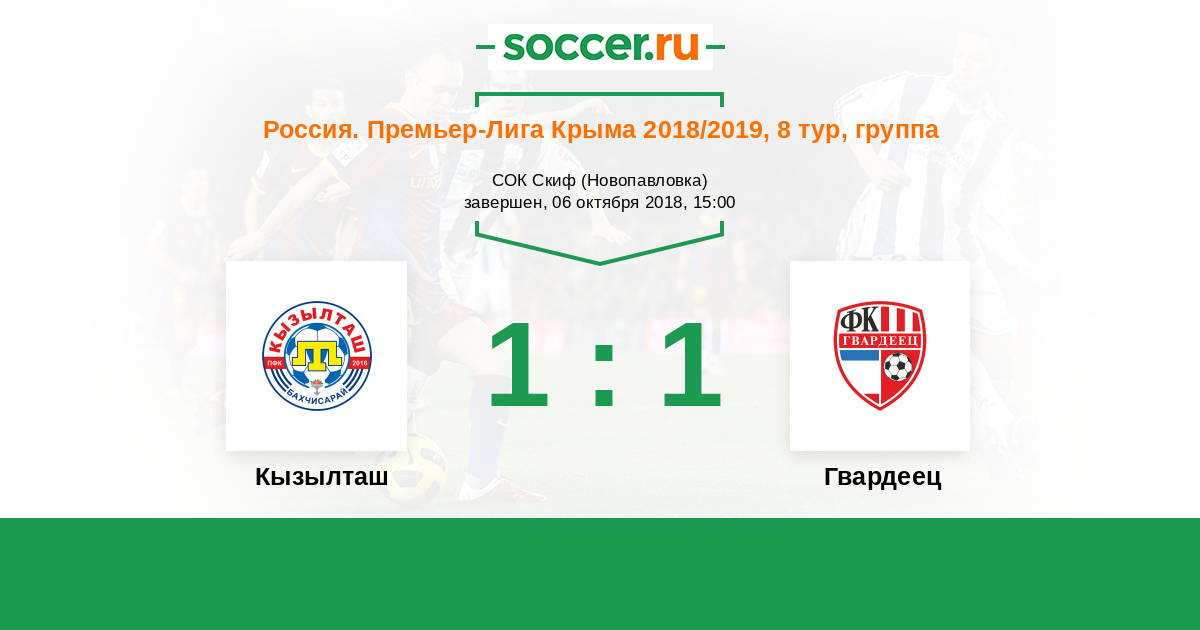 Россия. Премьер-Лига Крыма 19.08.2018 Гвардеец Логотип футбольный клуб Гвардеец (Аграрное) 0:3 Логотип футбольный клуб Кызылташ (Бахчисарай) Кызылташ