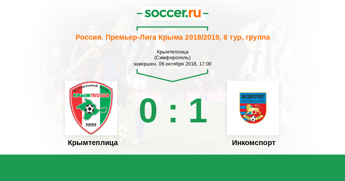 Россия. Премьер-Лига Крыма 19.08.2018 Инкомспорт Логотип футбольный клуб Инкомспорт (Ялта) 0:1 Логотип футбольный клуб Крымтеплица (Молодежное) Крымтеплица