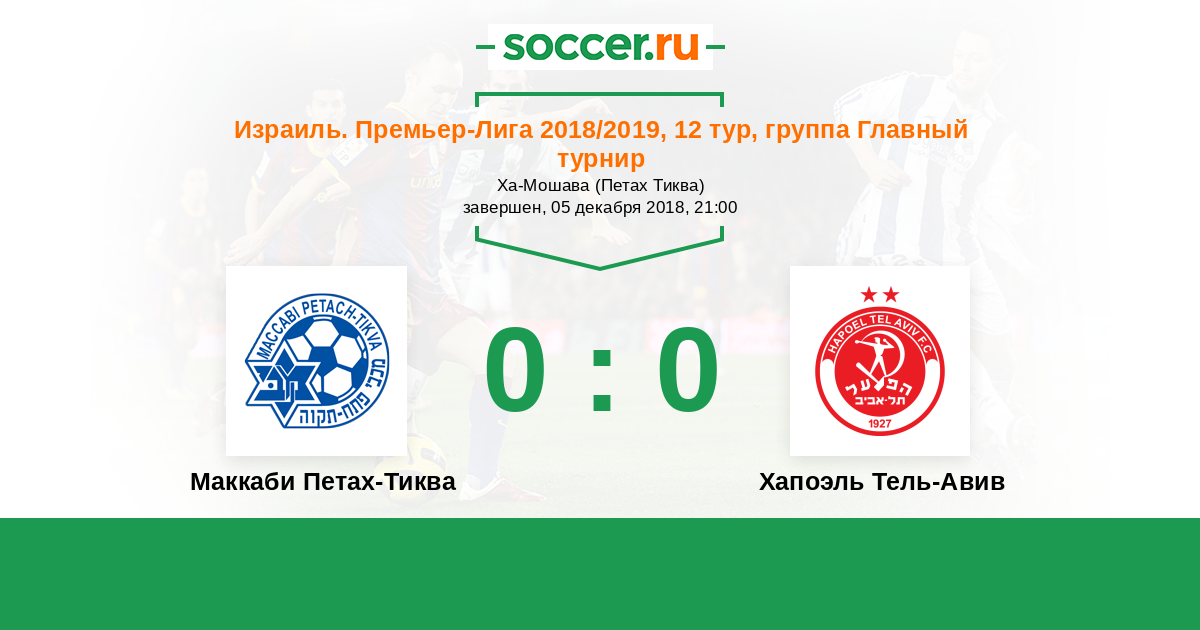 Израиль. Премьер-Лига 12.05.2019 Маккаби Петах-Тиква Логотип футбольный клуб Маккаби Петах-Тиква 0:2 Логотип футбольный клуб Хапоэль Тель-Авив Хапоэль Тель-Авив
