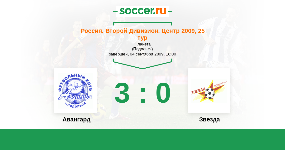 Россия. Вторая лига. Группа 3 04.06.2009 Звезда Логотип футбольный клуб Звезда (Серпухов) 1:1 Логотип футбольный клуб Авангард (Подольск) Авангард