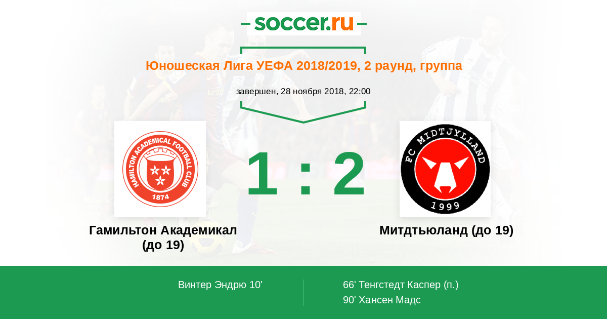 Протокол матча Гамильтон Академикал (до 19) против Митдтьюланд (до 19)