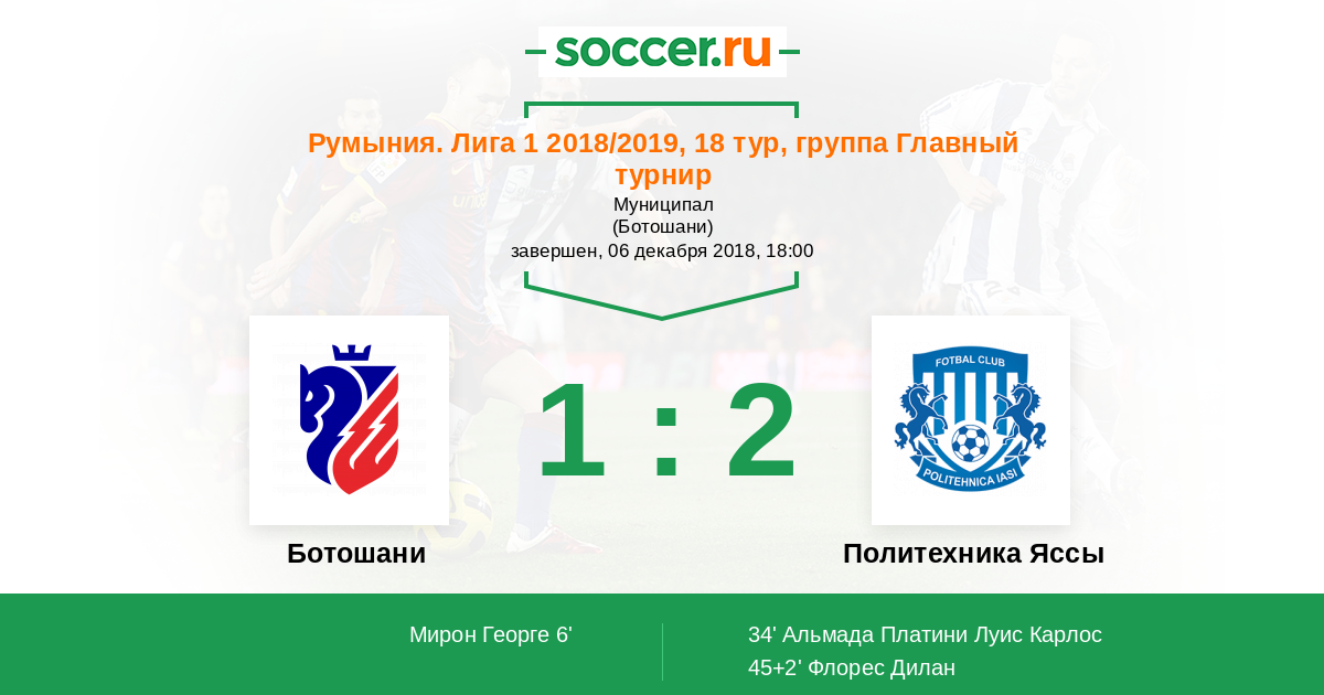 6' (1:0) Мирон Георге (4) (Фулоп Лоранд-Левент (80))
