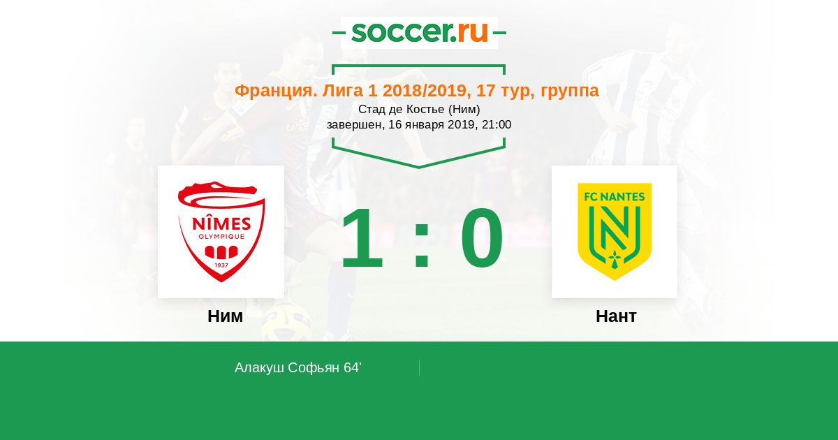 64' (1:0) Алакуш Софьян (29) (Рипар Рено (20))