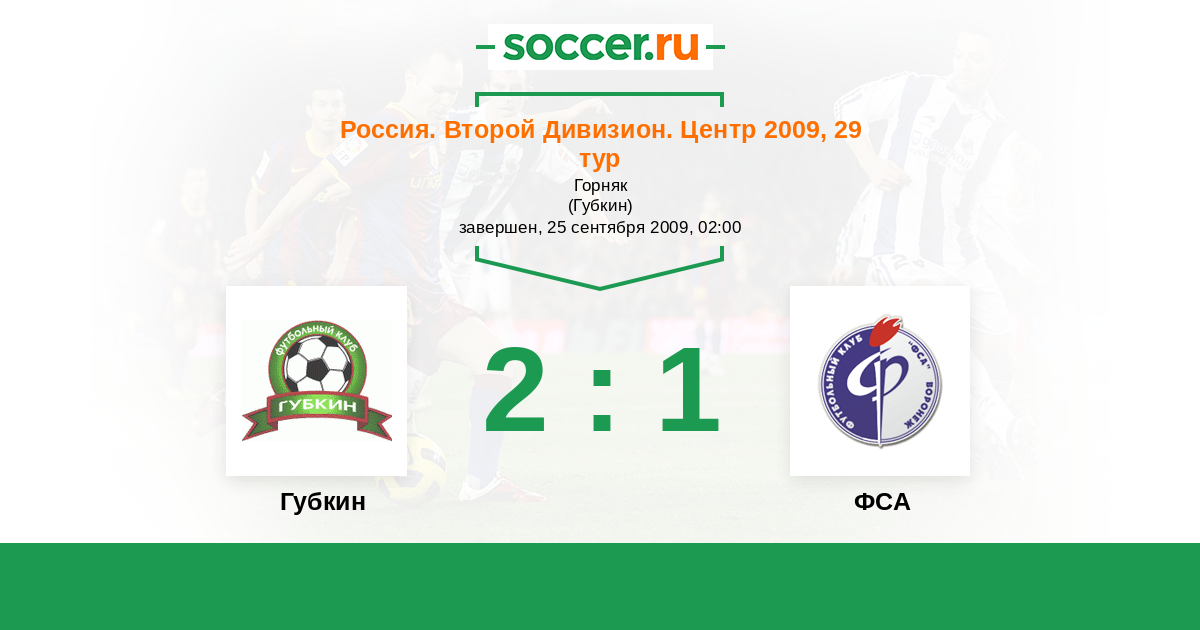 Россия. Вторая лига. Группа 3 25.09.2009 Губкин Логотип футбольный клуб Губкин 2:1 Логотип футбольный клуб ФСА (Воронеж) ФСА