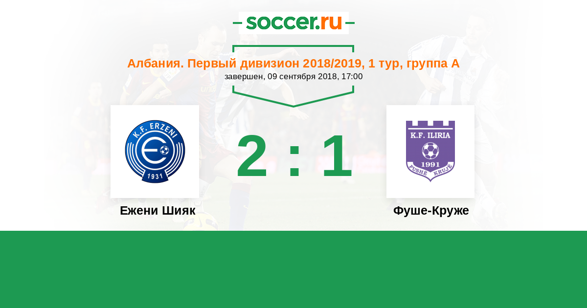 Албания. Первый дивизион 24.11.2018 Фуше-Круже Логотип футбольный клуб Фуше-Круже 0:1 Логотип футбольный клуб Эрзени Шияк Эрзени Шияк