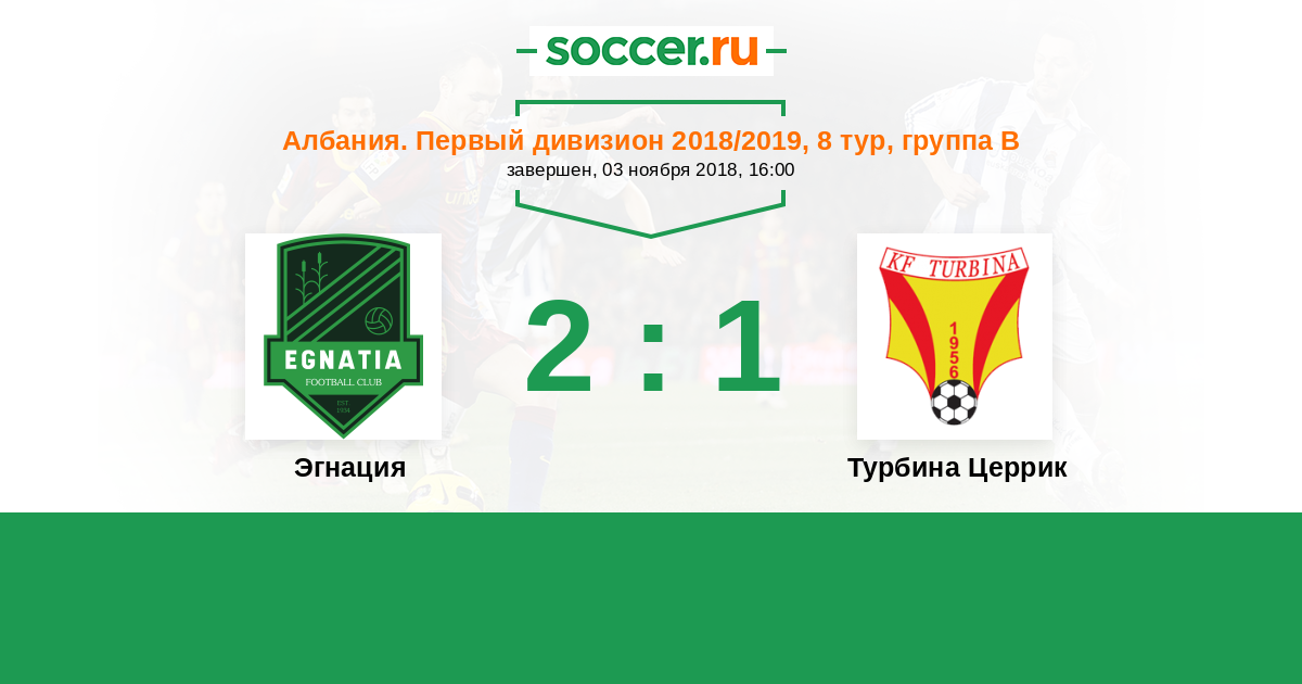 Албания. Второй дивизион: Группа А 04.11.2012 Турбина Церрик Логотип футбольный клуб Турбина Церрик 5:1 Логотип футбольный клуб Эгнация (Рогожина) Эгнация