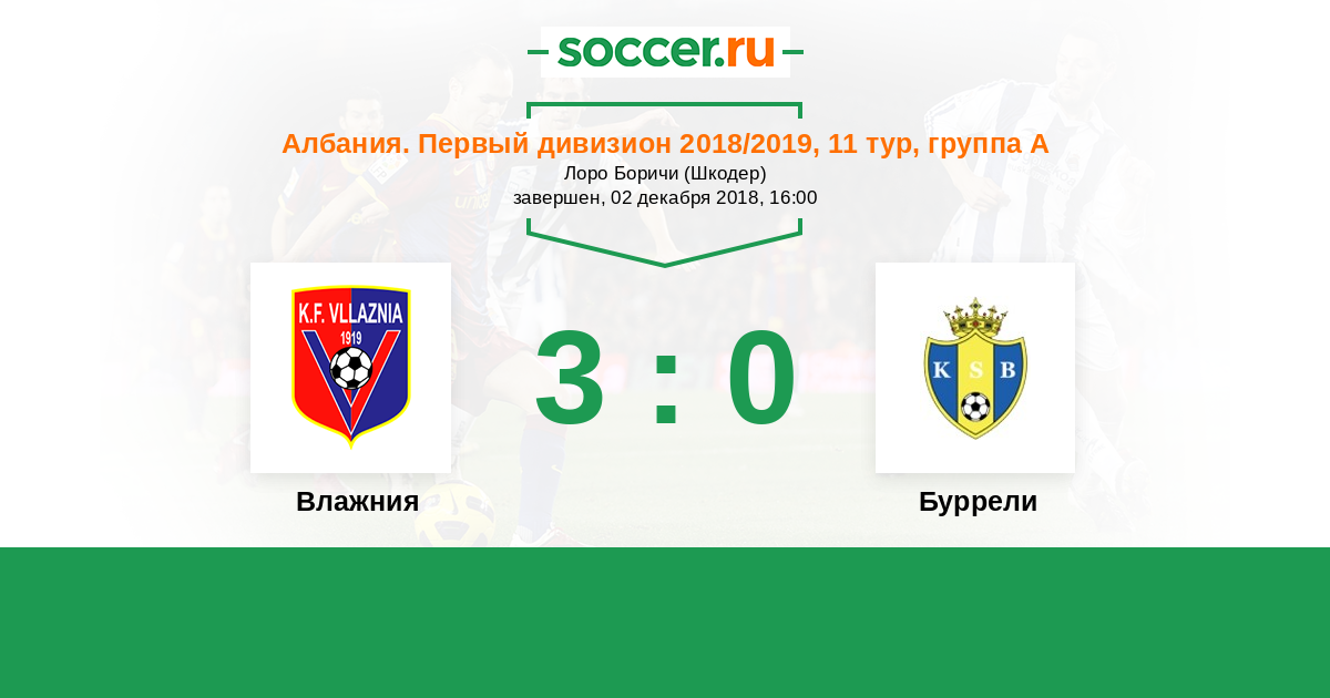 Албания. Первый дивизион 16.09.2018 Буррели Логотип футбольный клуб Буррели 0:2 Логотип футбольный клуб Влажния (Шкодер) Влажния