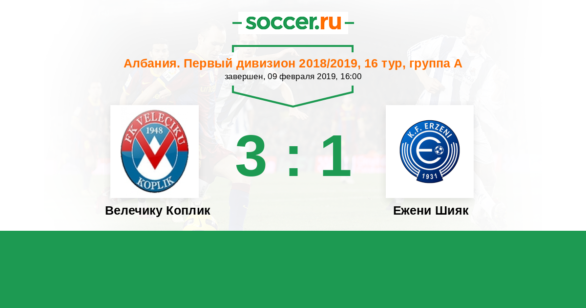 Албания. Первый дивизион 27.10.2018 Эрзени Шияк Логотип футбольный клуб Эрзени Шияк 2:1 Логотип футбольный клуб Велечику Коплик Велечику Коплик