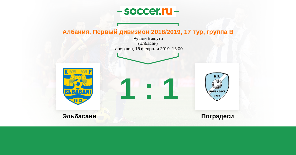 Албания. Первый дивизион 25.02.2017 Поградеси Логотип футбольный клуб Поградеси 2:1 Логотип футбольный клуб Эльбасани Эльбасани
