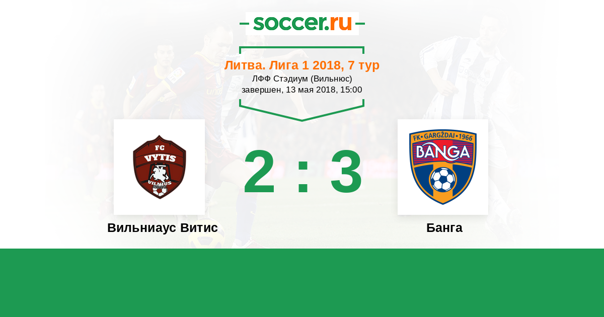 Литва. Лига 1 08.09.2018 Банга Логотип футбольный клуб Банга (Гаргждай) 1:2 Логотип футбольный клуб Вильниаус Витис (Вильнюс) Вильниаус Витис