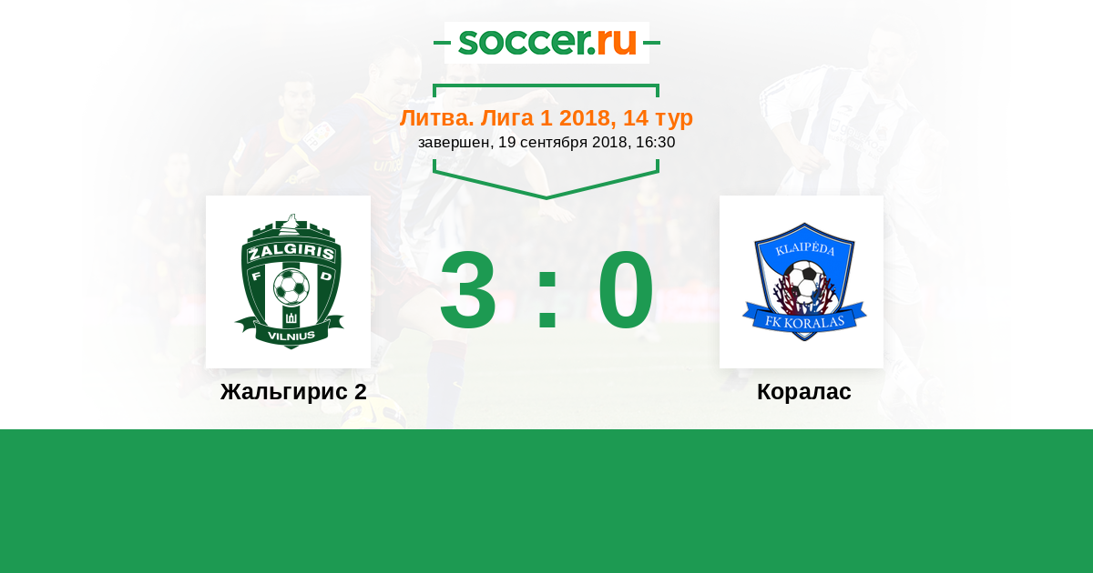 Литва. Лига 1 19.09.2018 Жальгирис 2 Логотип футбольный клуб Жальгирис 2 3:0 Логотип футбольный клуб Коралас (Клайпеда) Коралас
