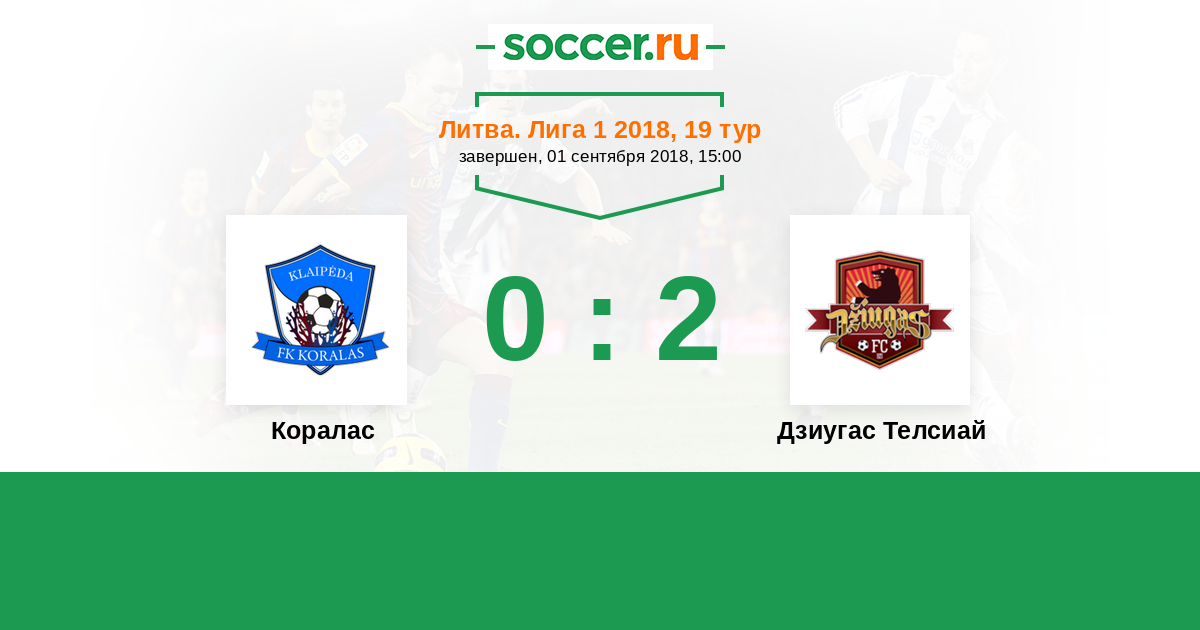 Литва. Лига 1 01.09.2018 Коралас Логотип футбольный клуб Коралас (Клайпеда) 0:2 Логотип футбольный клуб Дзиугас Телсиай (Тельшай) Дзиугас Телсиай