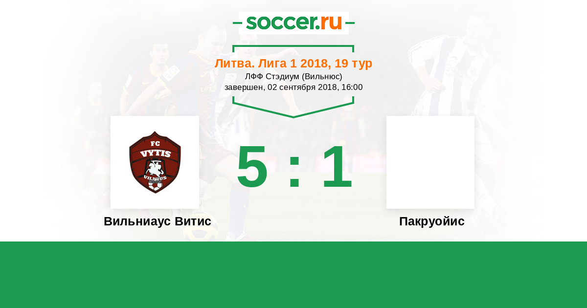 Литва. Лига 1 02.09.2018 Вильниаус Витис Логотип футбольный клуб Вильниаус Витис (Вильнюс) 5:1 Логотип футбольный клуб Пакруойис Пакруойис