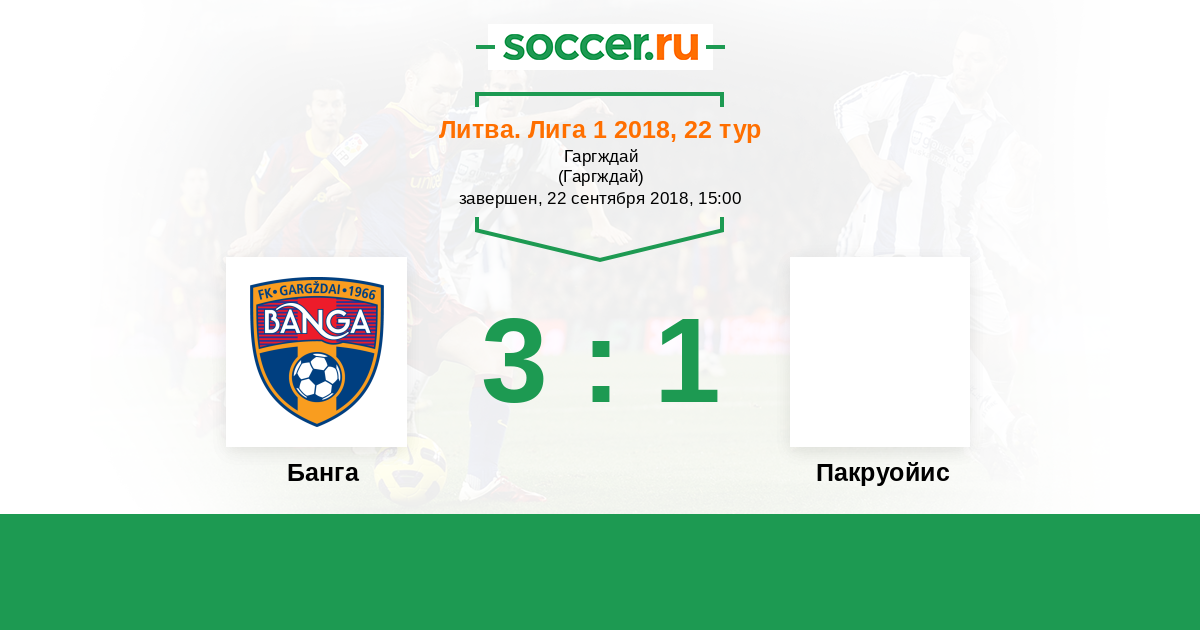 Литва. Лига 1 22.05.2018 Пакруойис Логотип футбольный клуб Пакруойис 0:1 Логотип футбольный клуб Банга (Гаргждай) Банга